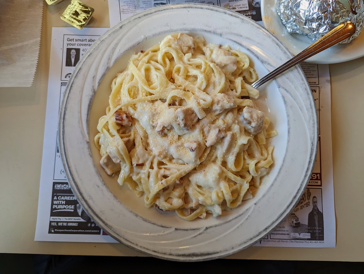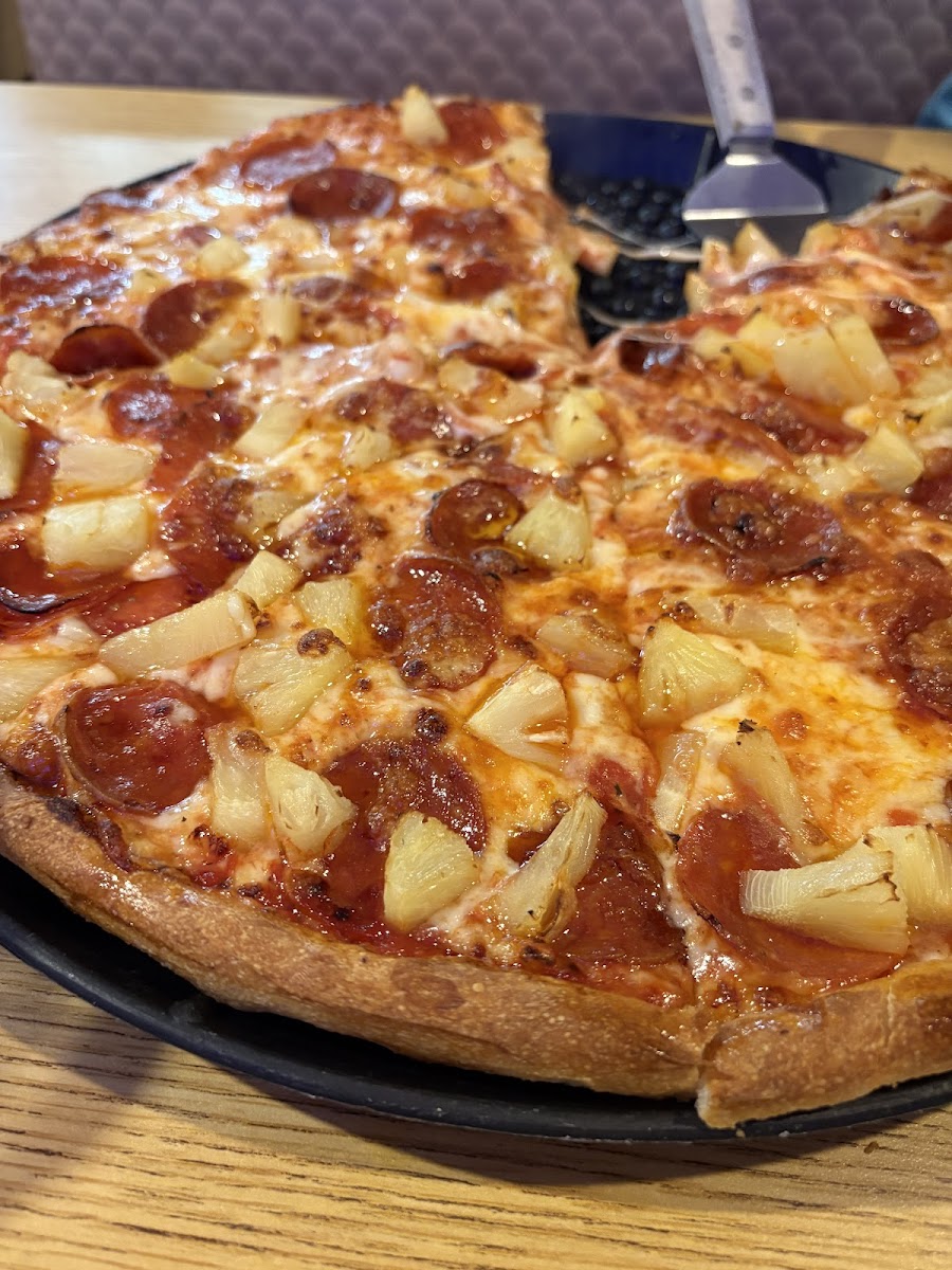 I’ve been going to Twin’s for over 50 years. Twin’s is an old-style Rhode Island pizzeria but is really a full service family restaurant offering seafood and American dishes. (Cheese is a topping choice but is not required. You can order a basic red pie with a dusting of Parmesan without mozzarella.) I ordered a small (round) pepperoni & mushroom pie with extra sauce, medium bake. (Large pies are rectangular.) It is a medium thick crust with crunchy crust edges. There are always 3 pepperoni pieces per triangular slice as is Twin’s custom. (If you prefer fresh mushrooms you can ask for them.) They offer beer and wine. Considering the take-out traffic, service was quick. Bread and butter was provided while we waited. They offer free refills on coffee and soft drinks, even for the large glass. I started with a cup of delicious red chowder. Total bill for 2 people was $23. Delicious!